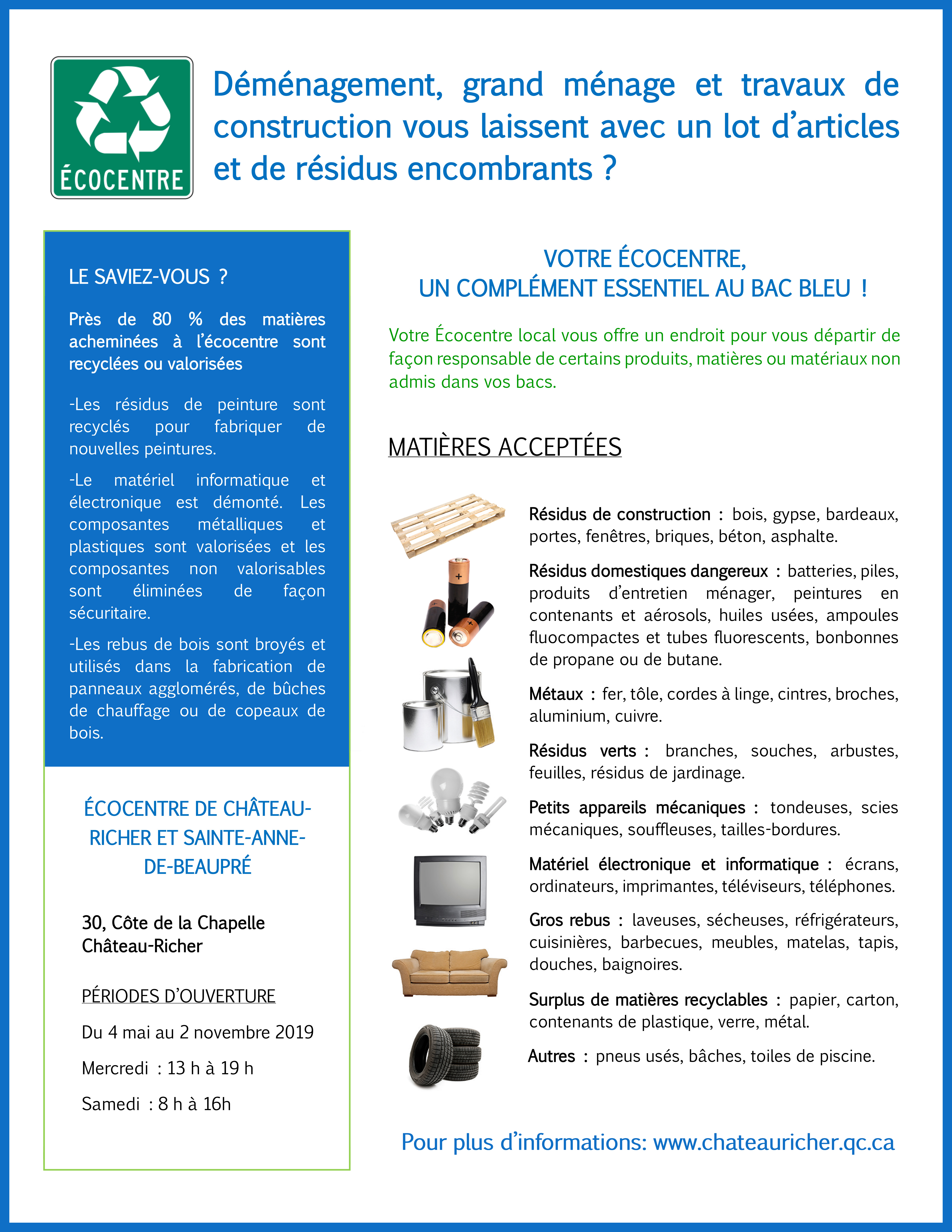 | L'écocentre de Château-Richer a été mis en place en collaboration avec la Ville de Sainte-Anne-de Beaupré, afin d'offrir ce service aux citoyens de ces deux municipalités. Vous devez vous présenter avec une preuve de résidence (permis de conduire, bail, facture électricité ou téléphone). Chaque citoyen a droit à 3 visites gratuites par année et les suivantes sont au coût de 20$ chacune. Il est situé au 30, Côte de la Chapelle, et il est ouvert de la mi-avril à novembre, tous les mercredis de 13H À 18H et les samedis 8H À 16H. Vous pourrez vous départir de presque tous les matériaux dont vous ne savez pas quoi faire.(Voir les détails) |